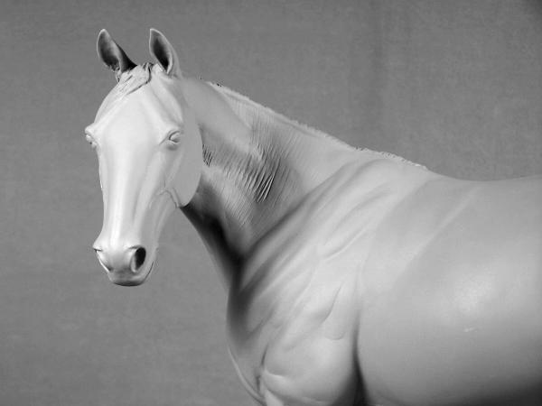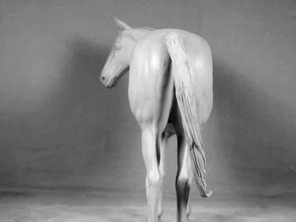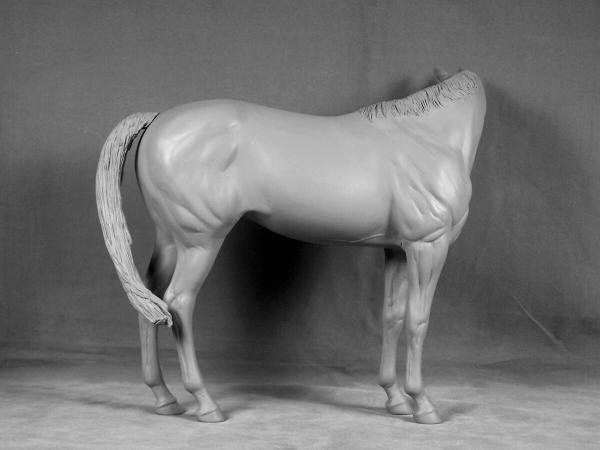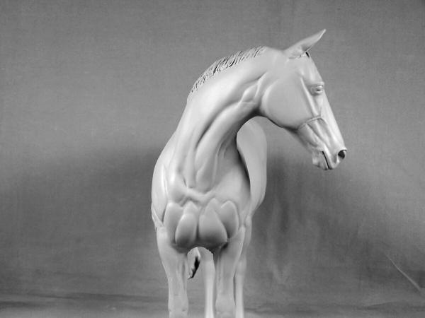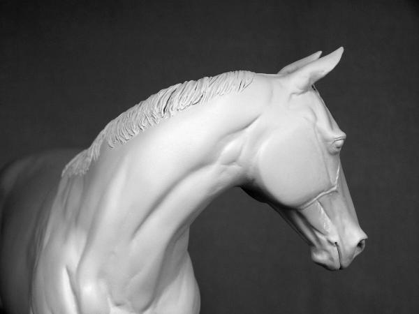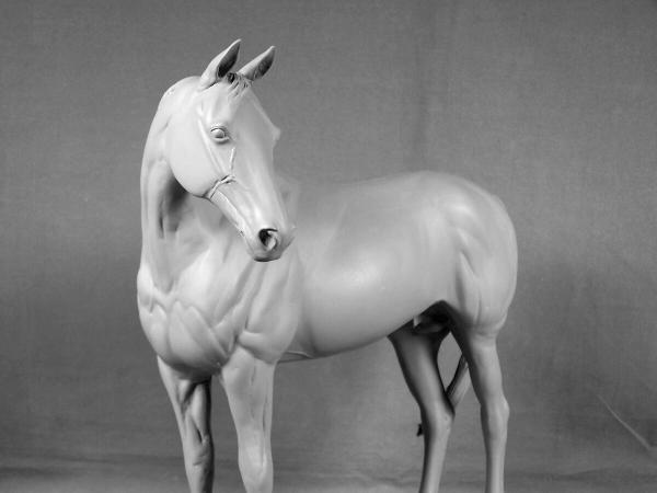 "Owenmore" was the name chosen for our new stallion as a nod to all our loyal customers for their long wait for this much anticipated new release because, of course, we always "owe them more" them we can ever convey! The name also is a tip of the hat to the countryside and horses that influenced his making. "Owenmore" is the English pronounciation of "abhainn mor", "big river" in gaelic Irish (the descriptive is after the noun like a lot of languages-so actually "river big"-LOL). There are several different "Owenmore" rivers that wind through the Irish countryside. A visit to the Irish National Stud a few years ago inspired this perky but tranquil Thoroughbred stallion. "Indian Ridge" was one of the stallions there that really caught our eye with his flame coloured coat on the outside and the obvious fire inside. His groom was willing to stop a minute, answer a few questions, and turn him about for pictures while taking him out to his pasture. We hope that this sculpture has captured some of that Thoroughbred spirit. "Owenmore" is large traditional size, measuring 9 1/2" at his eartips. He is a one mold run of 50 cast by MVS. Hollowcast with wire reinforcements in white resin Unpainted price $150.00 |