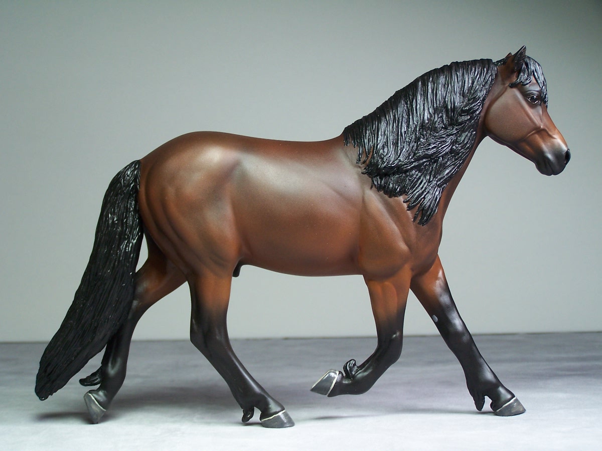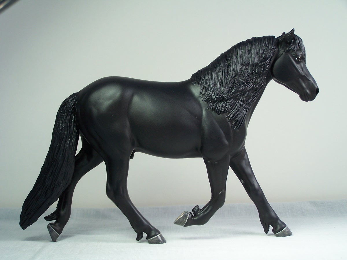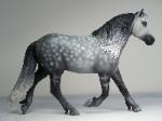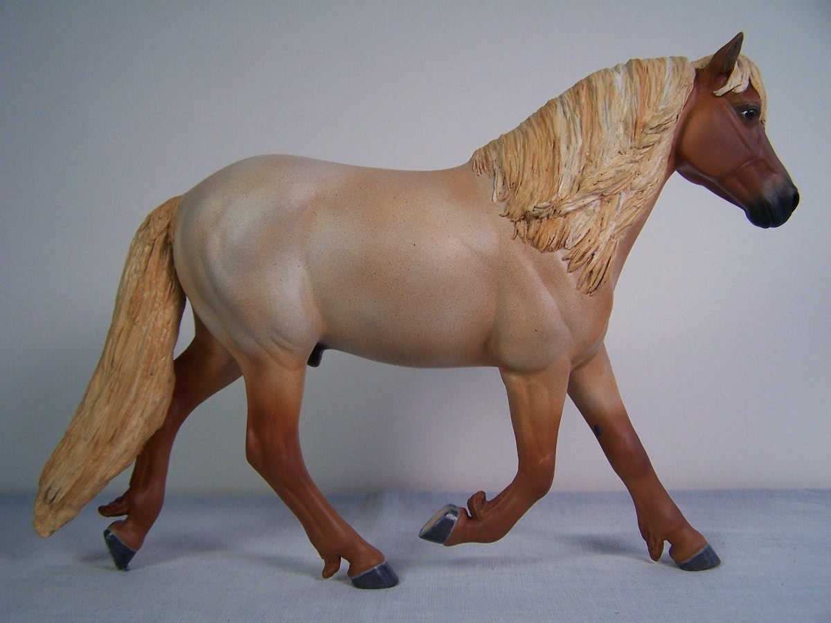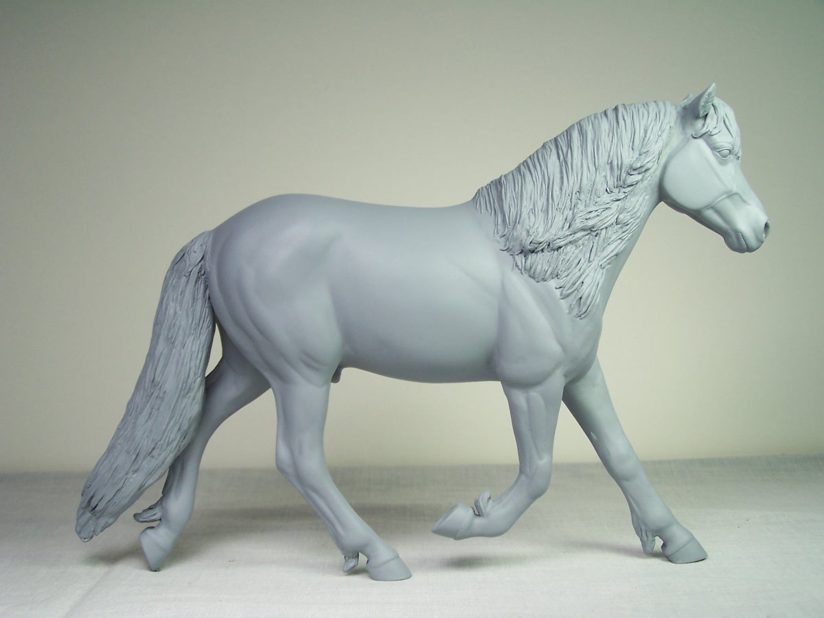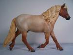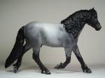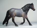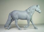 | Introducing our new trotting Newfoundland Pony Stallion "Maberly Prince". Newfoundland Ponies are a rare pony type that is listed by Rare Breeds Canada as a critically endangered species. The foundations of the Newfoundland Pony traces to Mountain and Moor type ponies that were brought to the Newfoundland area by settlers over four hundred years ago and put to work doing a multitude of tasks. Anything that needed doing on small farm or outport village the Newfoundland Pony earned his keep. Like many draft horse and pony breeds, their numbers drastically dropped when they were no longer thought necessary due to mechanization and modernization. In modern times they retain the good work ethic and traits of their ancestors and are used for work and the showring under saddle and in harness. The Newfoundland Pony Society was founded to help preserve the unique heritage bloodlines of this northern pony. Acceptable to the Society are pony height (from 11hh to 14.2hh) individuals and can be from a light draft type to a finer riding pony type. Many of their characteristics are due to harsh winter conditions and they develop heavy winter coats. They have thick manes and thick tails that are lowset. They have fetlock feathering that does not encircle the joint but rather forms a long tuft that goes beyond the point of the fetlock. Like many hardy ponies their hooves are small and flinty. Other characteristics are hairy inner ears,"snow chute" at top of tail and a nasal bump. Any solid color is acceptable and range from mealy bay to white (aged grey). Dun and roan are common and their winter coats can vary drastically from their summer coat color. Roans especially can be "radical changers" when it comes to coat color. Minimal white seems to be present. We would like to thank everyone at the Newfoundland Pony Society especially Patricia Morris and Barb Brown for all their time and efforts in helping us with this sculpture. |