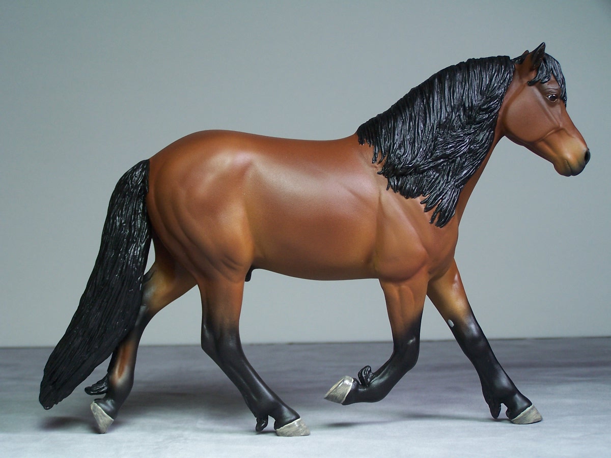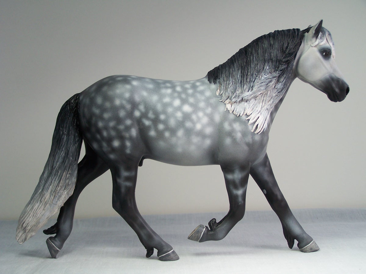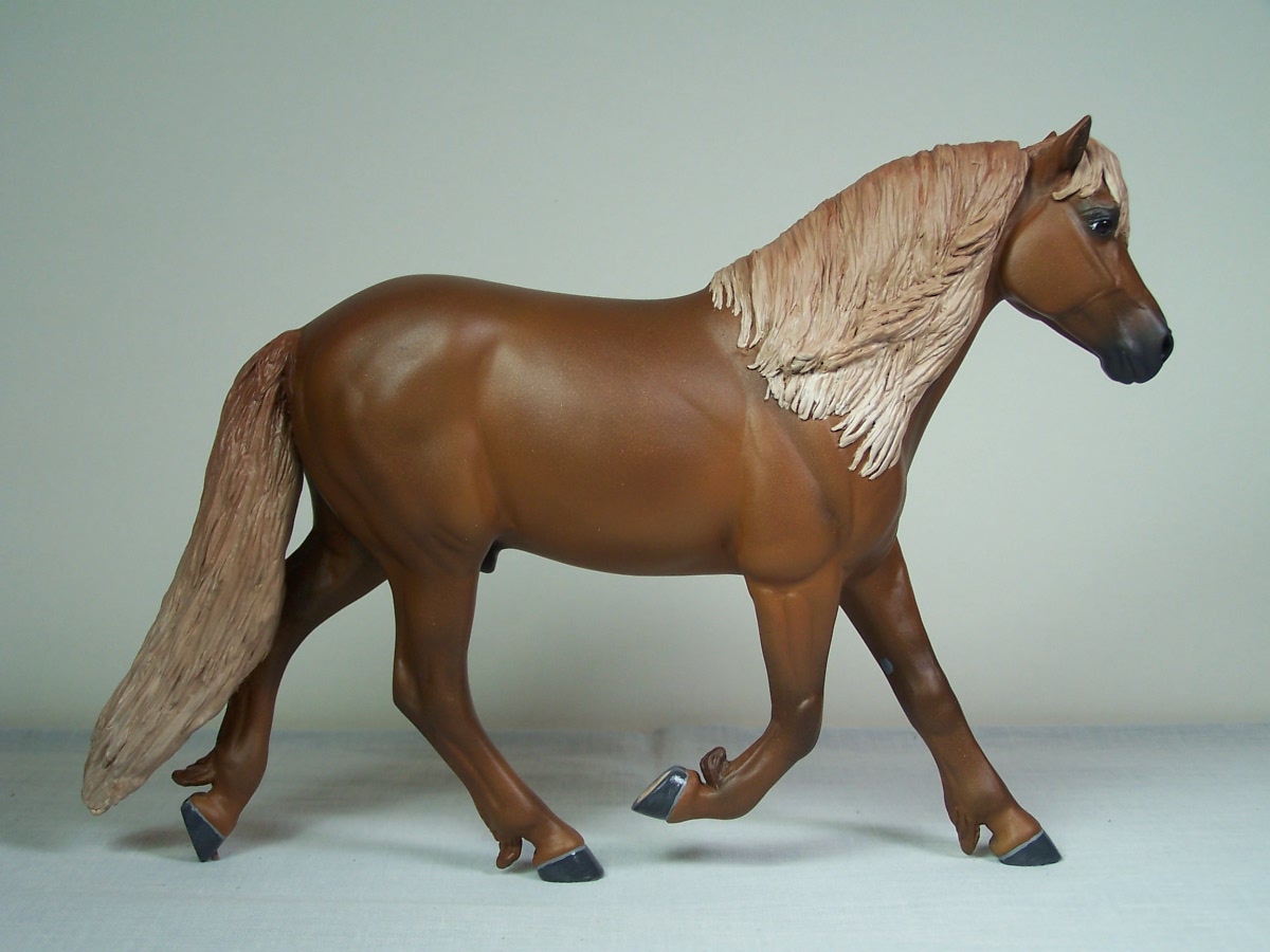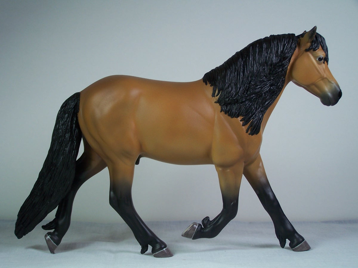 | Introducing our new trotting Newfoundland Pony Stallion "Maberly Prince". Newfoundland Ponies are a rare pony type that is listed by Rare Breeds Canada as a critically endangered species. The foundations of the Newfoundland Pony traces to Mountain and Moor type ponies that were brought to the Newfoundland area by settlers over four hundred years ago and put to work doing a multitude of tasks. Anything that needed doing on small farm or outport village the Newfoundland Pony earned his keep. Like many draft horse and pony breeds, their numbers drastically dropped when they were no longer thought necessary due to mechanization and modernization. In modern times they retain the good work ethic and traits of their ancestors and are used for work and the showring under saddle and in harness. The Newfoundland Pony Society was founded to help preserve the unique heritage bloodlines of this northern pony. Acceptable to the Society are pony height (from 11hh to 14.2hh) individuals and can be from a light draft type to a finer riding pony type. Many of their characteristics are due to harsh winter conditions and they develop heavy winter coats. They have thick manes and thick tails that are lowset. They have fetlock feathering that does not encircle the joint but rather forms a long tuft that goes beyond the point of the fetlock. Like many hardy ponies their hooves are small and flinty. Other characteristics are hairy inner ears,"snow chute" at top of tail and a nasal bump. Any solid color is acceptable and range from mealy bay to white (aged grey). Dun and roan are common and their winter coats can vary drastically from their summer coat color. Roans especially can be "radical changers" when it comes to coat color. Minimal white seems to be present. We would like to thank everyone at the Newfoundland Pony Society especially Patricia Morris and Barb Brown for all their time and efforts in helping us with this sculpture. |