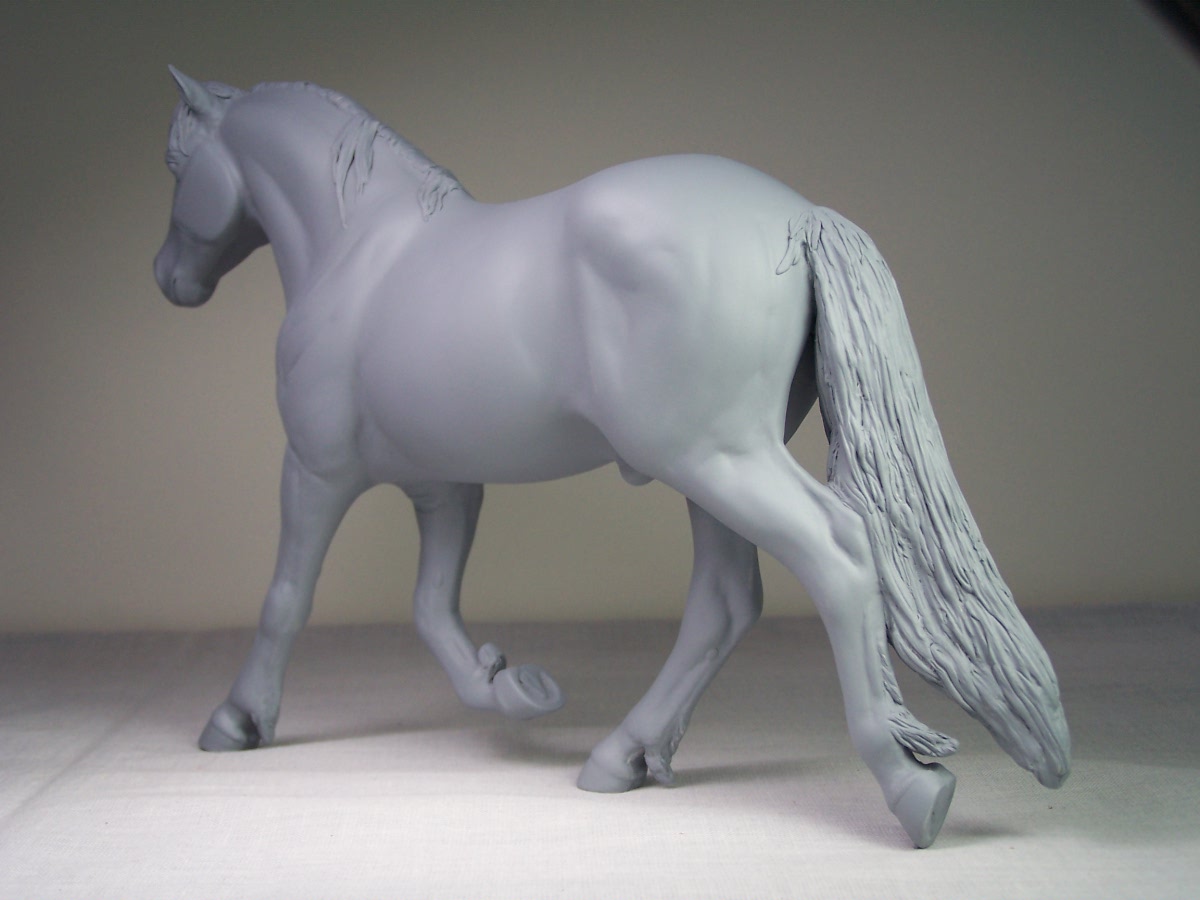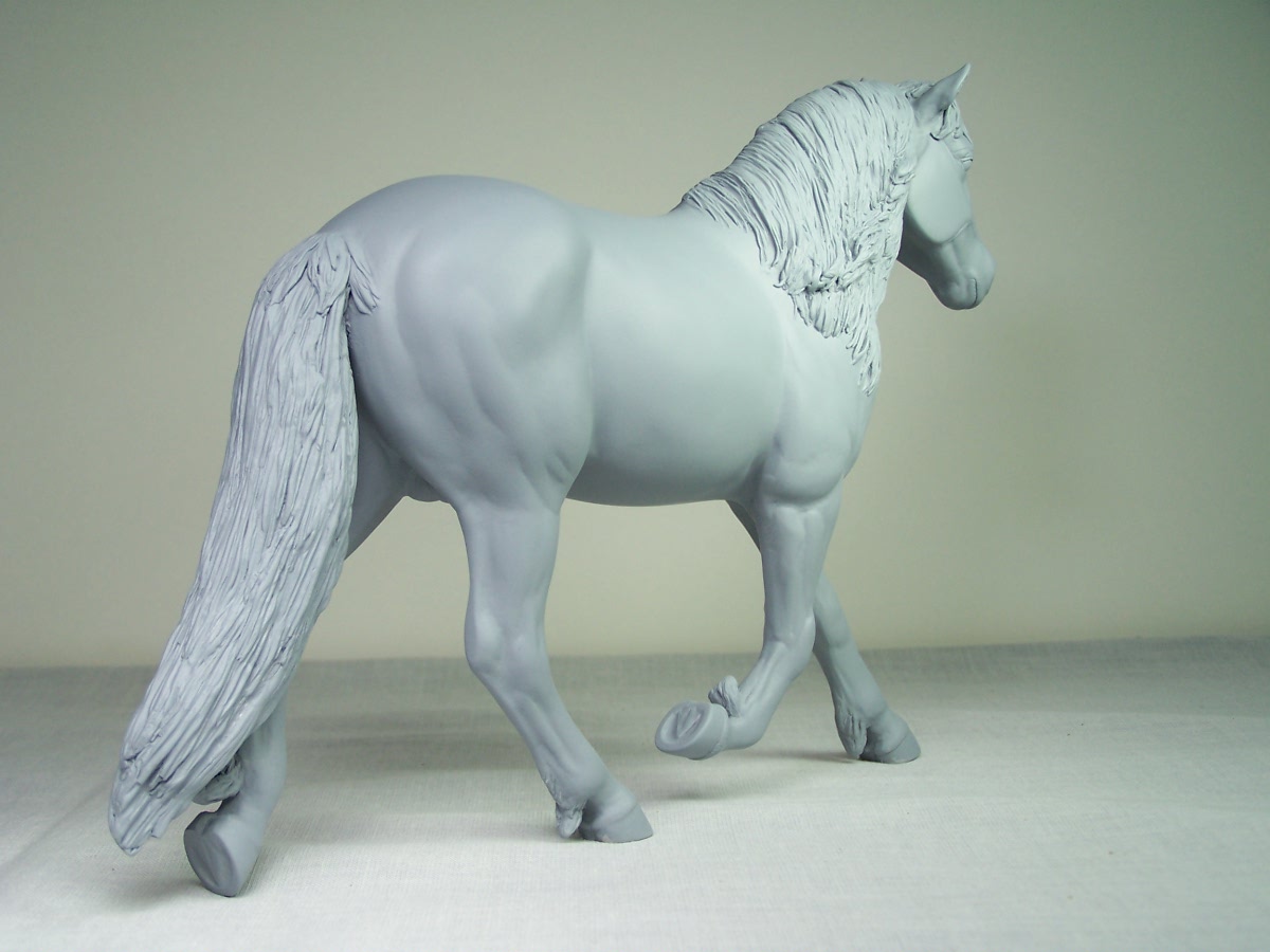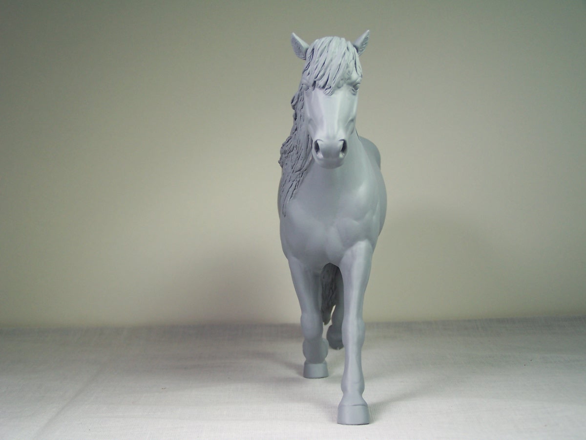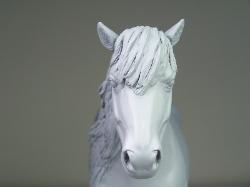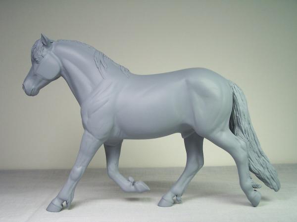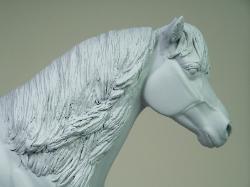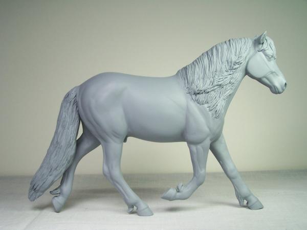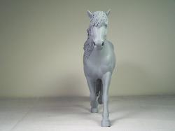 | Introducing our new trotting Newfoundland Pony Stallion "Maberly Prince". Newfoundland Ponies are a rare pony type that is listed by Rare Breeds Canada as a critically endangered species. The foundations of the Newfoundland Pony traces to Mountain and Moor type ponies that were brought to the Newfoundland area by settlers over four hundred years ago and put to work doing a multitude of tasks. Anything that needed doing on small farm or outport village the Newfoundland Pony earned his keep. Like many draft horse and pony breeds, their numbers drastically dropped when they were no longer thought necessary due to mechanization and modernization. In modern times they retain the good work ethic and traits of their ancestors and are used for work and the showring under saddle and in harness. The Newfoundland Pony Society was founded to help preserve the unique heritage bloodlines of this northern pony. Acceptable to the Society are pony height (from 11hh to 14.2hh) individuals and can be from a light draft type to a finer riding pony type. Many of their characteristics are due to harsh winter conditions and they develop heavy winter coats. They have thick manes and thick tails that are lowset. They have fetlock feathering that does not encircle the joint but rather forms a long tuft that goes beyond the point of the fetlock. Like many hardy ponies their hooves are small and flinty. Other characteristics are hairy inner ears,"snow chute" at top of tail and a nasal bump. Any solid color is acceptable and range from mealy bay to white (aged grey). Dun and roan are common and their winter coats can vary drastically from their summer coat color. Roans especially can be "radical changers" when it comes to coat color. Minimal white seems to be present. We would like to thank everyone at the Newfoundland Pony Society especially Patricia Morris and Barb Brown for all their time and efforts in helping us with this sculpture. |
